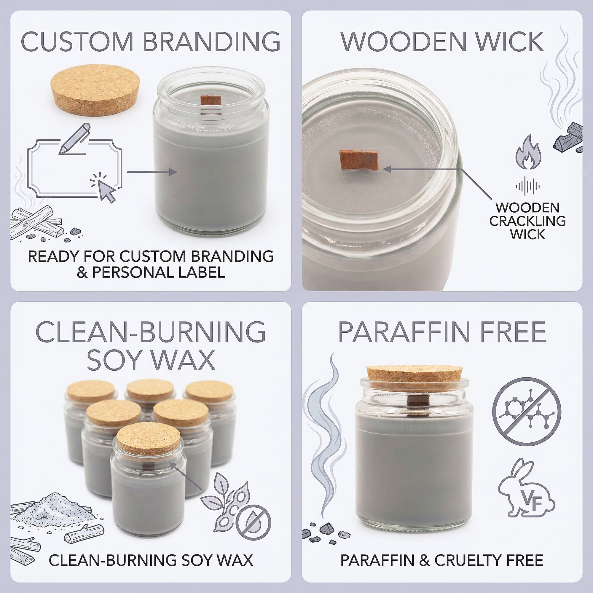 Create a warm, atmospheric mood with Ash & Woodsmoke. This white label wood wick soy candle offers a clean, modern candle ready for your own branding. The clear glass jar with natural cork lid provides a minimalist base ideal for private label home fragrance collections.