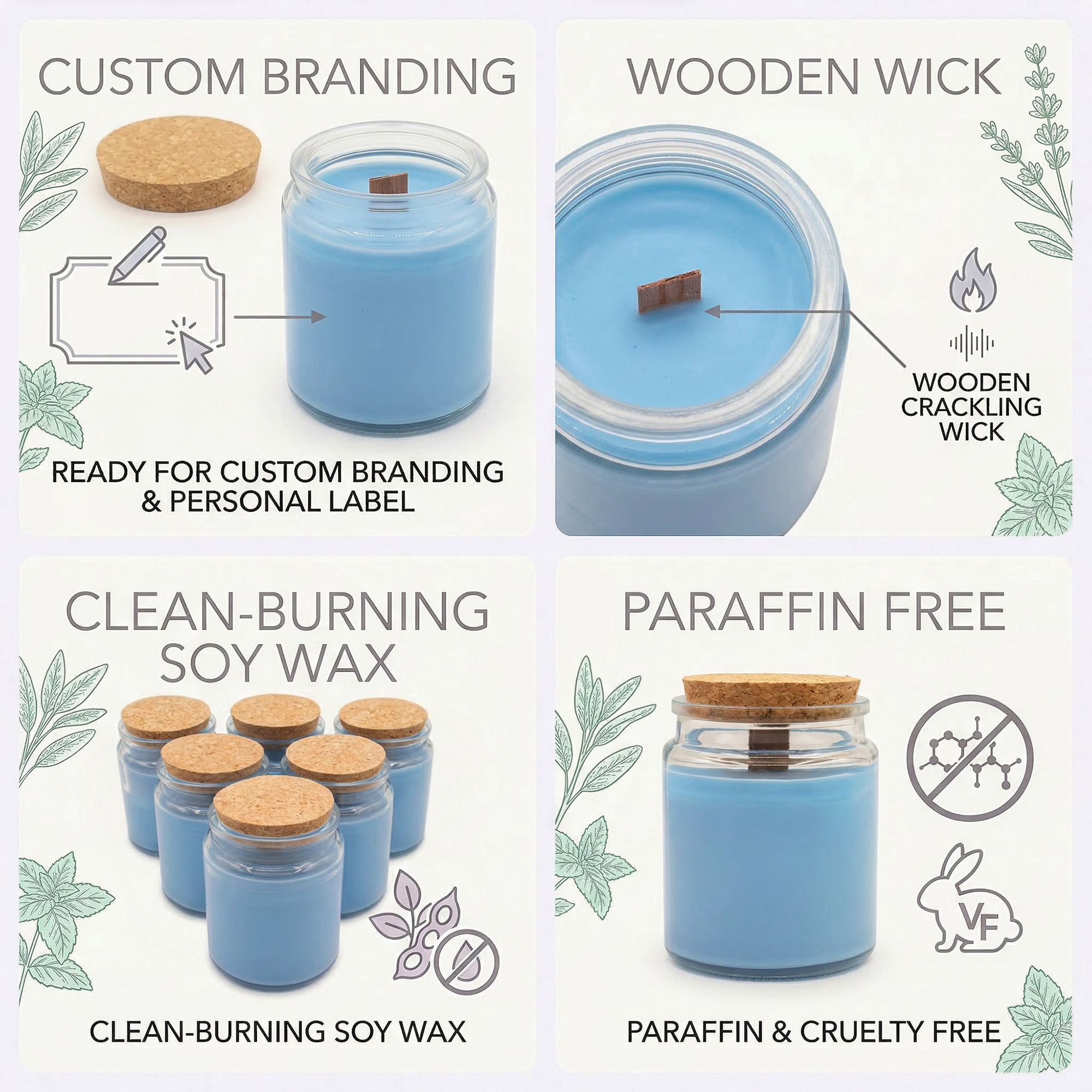 Refresh your fragrance range with the crisp, herbal scent of Sage & Mint Wood. This white label wood wick soy candle is designed for retailers who want a clean, modern product ready for custom branding. The clear glass jar with natural cork lid creates a minimalist look that works well for private-label collections.